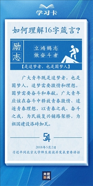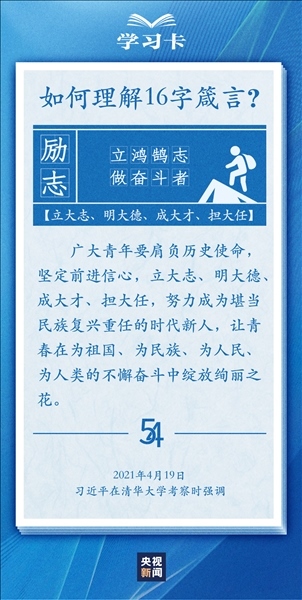 青春,是人生最美的時光。青年,是國家的未來和民族的希望。每每與青年對話,習(xí)近平總書記無不囑托青年“立大志”“堅(jiān)定理想信念”“擔(dān)當(dāng)復(fù)興大任”,言之諄諄,意之殷殷。對于新時代青年如何走好人生路,習(xí)近平總書記2018年提出十六字箴言,字短意長。今天,一起學(xué)習(xí)↓