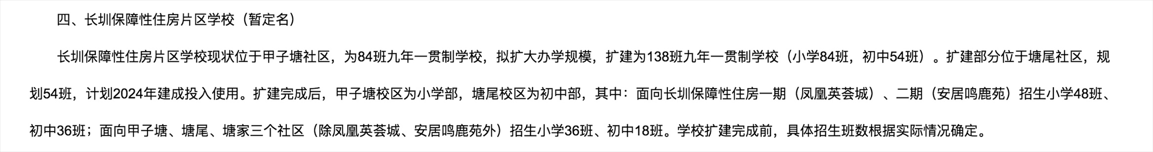 2023年4月10日,深圳市光明區(qū)教育局發(fā)布的《光明區(qū)2023年義務(wù)教育階段新增公辦學(xué)校學(xué)區(qū)劃分方案(征求意見稿)》第三條提到,長圳保障房配套學(xué)校(暫定名)學(xué)位在保障光明區(qū)長圳保障性住房(鳳凰英薈城、安居鳴鹿苑)小區(qū)住戶子女需求外,剩余學(xué)位面向全區(qū)招生。
