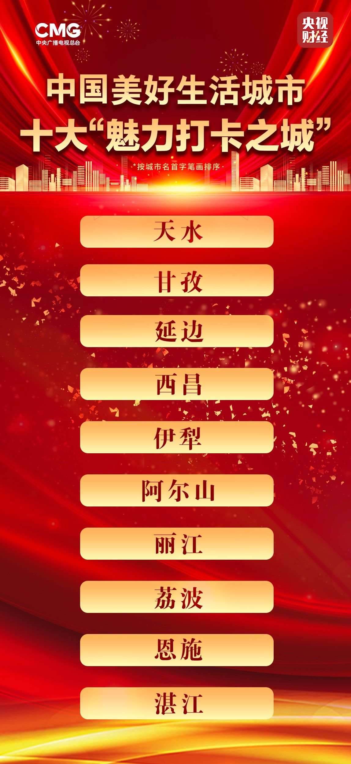 十大“魅力打卡之城”是天水、甘孜、延邊、西昌、伊犁、阿爾山、麗江、荔波、恩施、湛江(城市均以首字筆畫(huà)排序)。