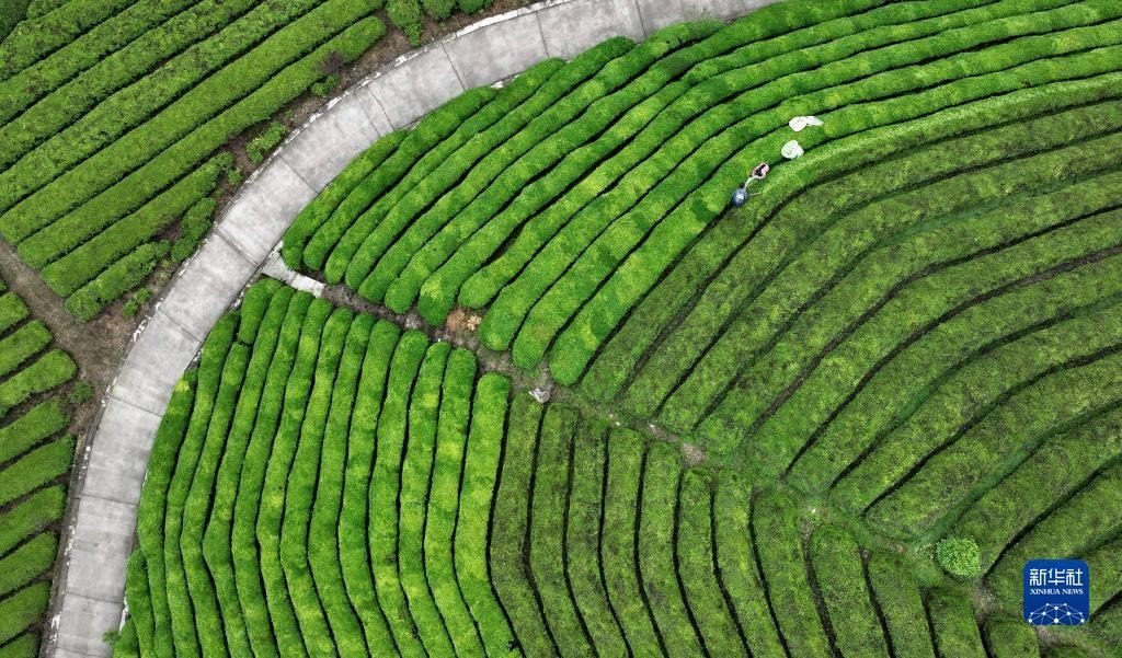 5月7日,茶農(nóng)在鶴峰縣走馬鎮(zhèn)楊柳池茶園采茶(無人機(jī)照片)。