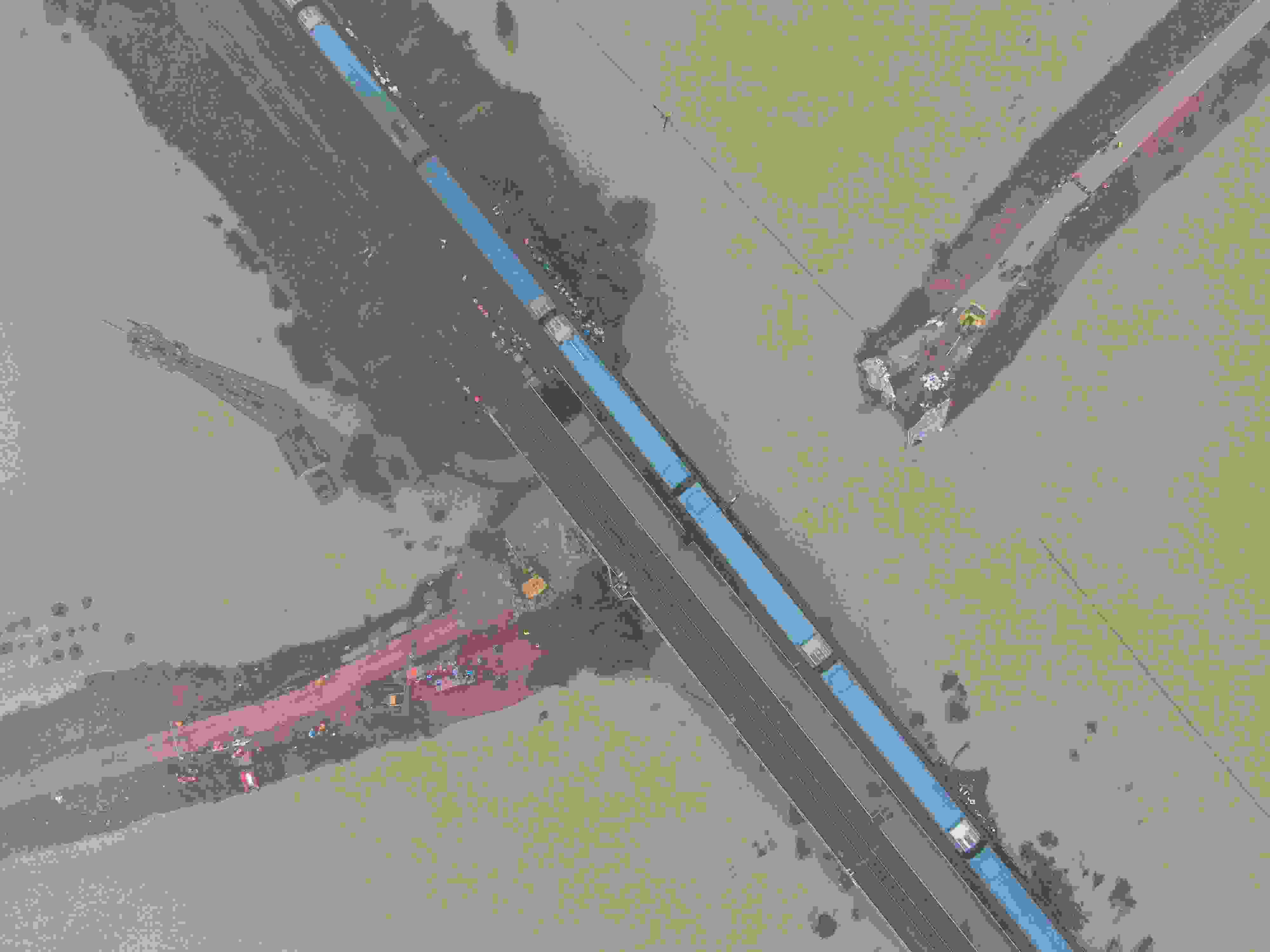 2023年5月6日,江西宜春,航拍清豐堤河堤潰口現(xiàn)場(chǎng),一列火車從潰口上方的鐵路橋上經(jīng)過(guò),橋下的救援隊(duì)伍正在開(kāi)展搶險(xiǎn)救援工作。 視覺(jué)中國(guó)