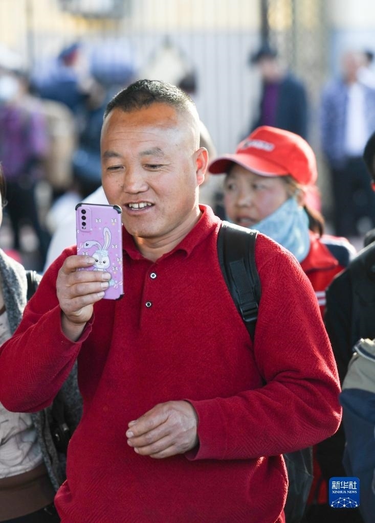 在綏化火車站站臺,乘客在等候K5151次列車時(shí)與親友視頻通話(5月6日攝)。