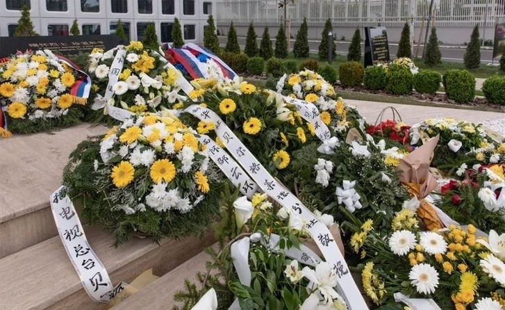 這是2022年5月7日在塞爾維亞貝爾格萊德的中國駐南斯拉夫聯(lián)盟大使館舊址紀念碑前拍攝的花圈。新華社發(fā)(王韡 攝)