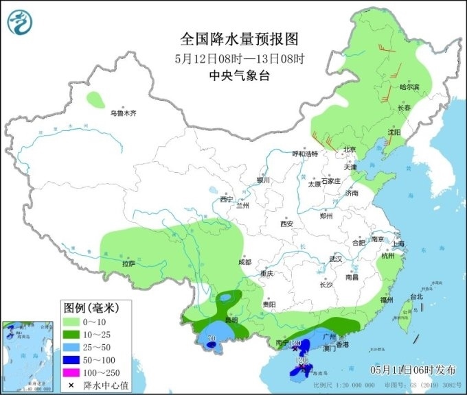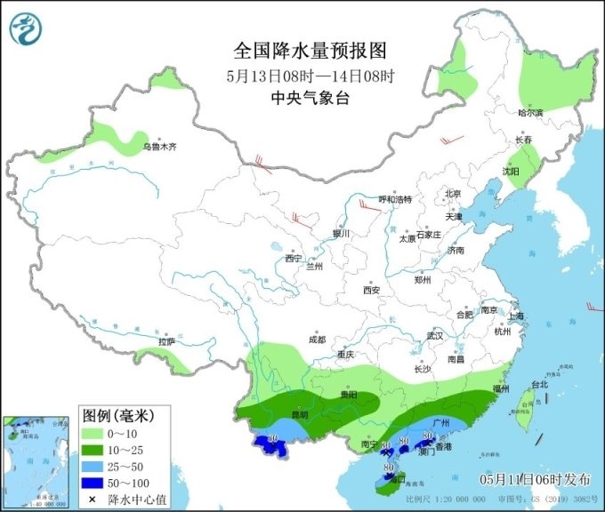 預計未來三天(11日至13日),華南地區(qū)仍有較強降雨,廣西、廣東、海南島等地大部地區(qū)日雨量有中到大雨,局地暴雨或大暴雨;此外,云南中南部有中到大雨,局地暴雨。