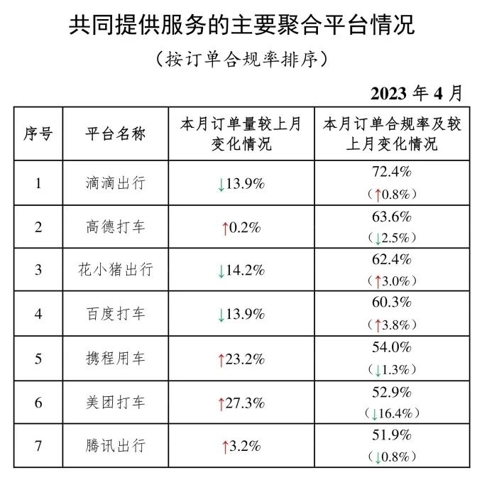 其中,面向乘客、與網(wǎng)約車平臺公司共同提供服務(wù)的平臺(俗稱“聚合平臺”)完成1.96億單,環(huán)比下降0.7%。按訂單合規(guī)率由高到低的分別是滴滴出行、高德打車、花小豬出行、百度打車、攜程用車、美團打車、騰訊出行。