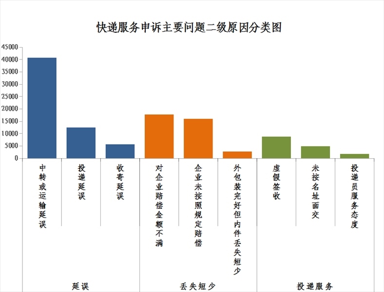 2.快遞服務(wù)申訴主要問(wèn)題二級(jí)原因情況。快件延誤申訴中主要占比較多的是中轉(zhuǎn)或運(yùn)輸延誤,快件丟失短少申訴中主要占比較多的是對(duì)企業(yè)賠償金額不滿,投遞服務(wù)申訴中主要占比較多的是虛假簽收。