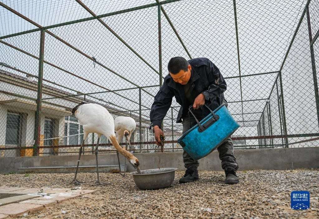 5月11日,徐沃德樂胡在觀察救助的丹頂鶴進(jìn)食。