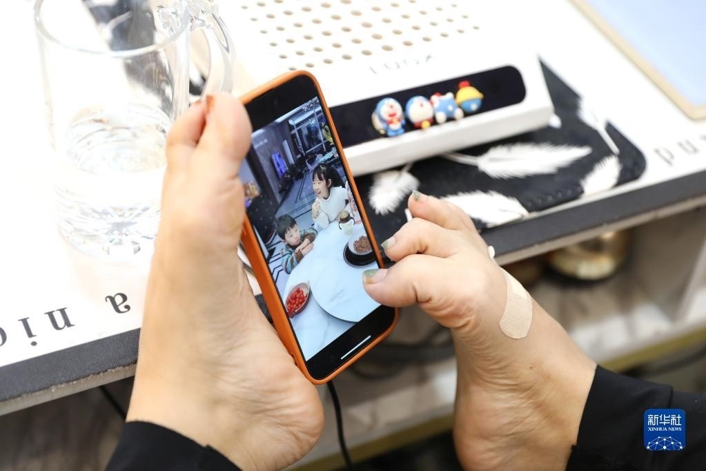 5月11日,韓丹翻看著手機(jī)里兩個(gè)孩子的視頻。