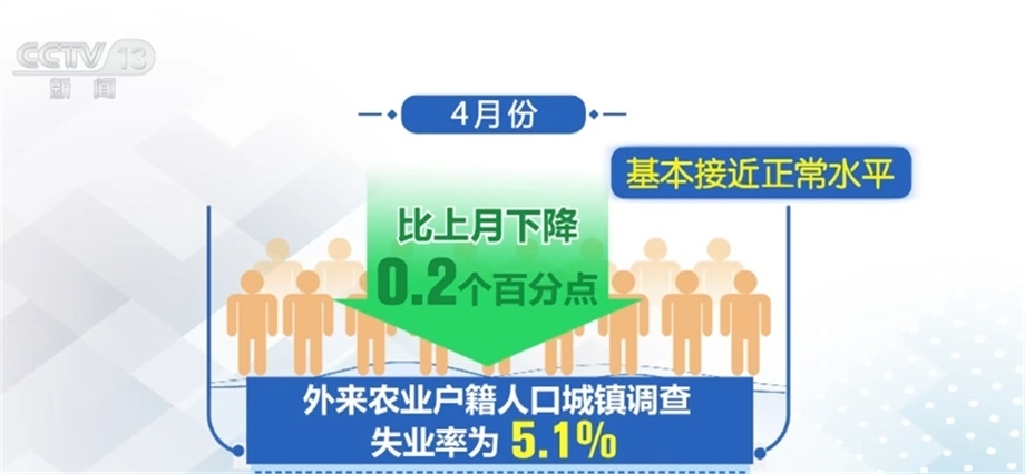 全國城鎮(zhèn)調(diào)查失業(yè)率連續(xù)兩個(gè)月下降。4月份,全國城鎮(zhèn)調(diào)查失業(yè)率為5.2%,比上月下降0.1個(gè)百分點(diǎn),接近2019年疫情前的統(tǒng)計(jì)水平。