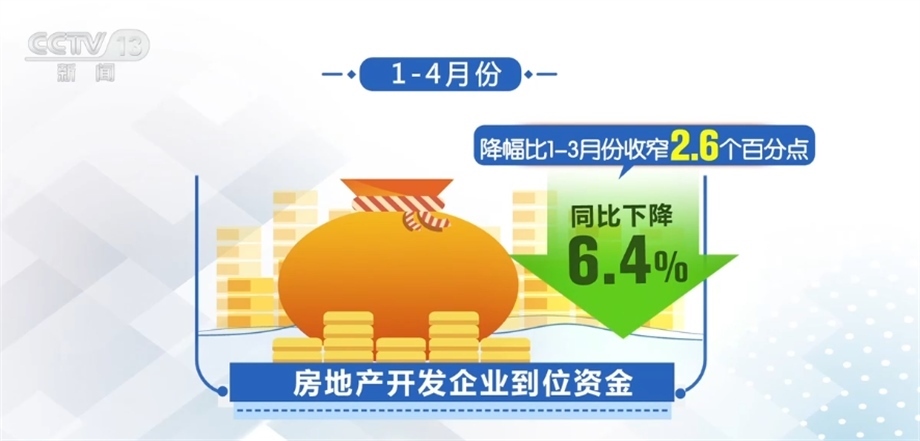 從房企資金看,受到市場銷售改善影響,房地產(chǎn)開發(fā)企業(yè)資金緊張狀況有所緩解,1—4月份,房地產(chǎn)開發(fā)企業(yè)到位資金同比下降6.4%,降幅比1—3月份收窄2.6個(gè)百分點(diǎn)。