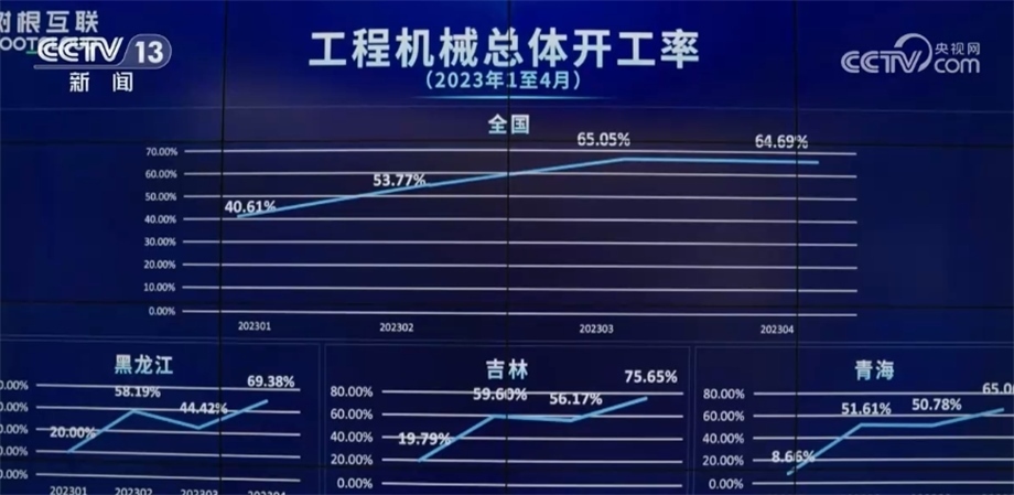 這個(gè)大屏幕反映的是全國(guó)挖掘機(jī)的開工情況,相關(guān)負(fù)責(zé)人告訴記者,“挖掘機(jī)指數(shù)”顯示出今年我國(guó)工程機(jī)械行業(yè)開始出現(xiàn)回暖跡象。4月份,全國(guó)工程機(jī)械總體開工率為64.69%,環(huán)比3月基本持平。12個(gè)?。▍^(qū)、市)創(chuàng)下今年以來最好成績(jī)。