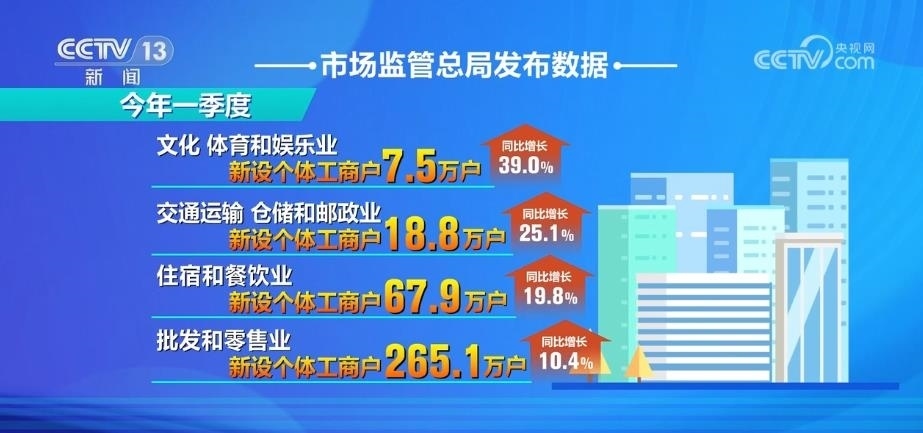市場監(jiān)管總局發(fā)布數(shù)據(jù)顯示,今年一季度,文化、體育和娛樂業(yè),交通運(yùn)輸、倉儲和郵政業(yè),住宿和餐飲業(yè),批發(fā)和零售業(yè)等行業(yè)新設(shè)個(gè)體工商戶分別為7.5萬戶、18.8萬戶、67.9萬戶、265.1萬戶,同比分別增長39.0%、25.1%、19.8%、10.4%。