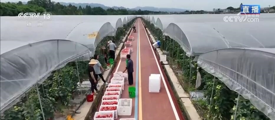我身后就是一大片番茄種植棚,整齊栽種行距方便管理與采摘,噴灌、滴灌設備能讓番茄更加水潤多汁,而且番茄植株在生長的過程中,也形成了果實漸次成熟的立體梯度,讓整個采摘季能達到一個多月。這一片設施農業(yè),一天產出的番茄總量達到了兩三萬斤,不僅服務了成渝雙城經(jīng)濟圈,據(jù)說五月份最遠的一份訂單是供應大灣區(qū)的。說到設施農業(yè),除了設施變得更科學、更智慧之外,現(xiàn)在的訂單農業(yè)也在幫助農民獲得更準確的銷售網(wǎng)絡。