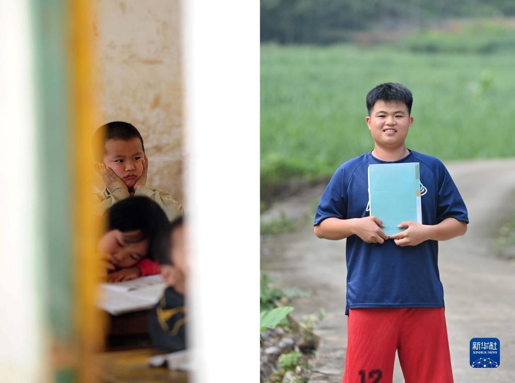 拼版照片:左圖為2012年3月27日,在大化瑤族自治縣大化鎮(zhèn)仁良小學,6歲的韋康濤在教室里上課(新華社記者黃孝邦攝);右圖為在大化瑤族自治縣高級中學讀高二的韋康濤(新華社記者胡星宇 2023年5月21日攝)。韋康濤的夢想是考上理想的大學。