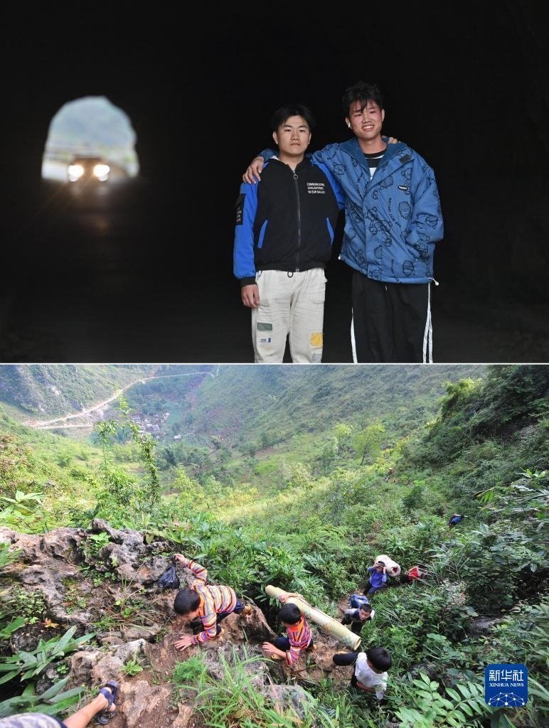 拼版照片:上圖為2023年1月20日,在大化瑤族自治縣板升鄉(xiāng)弄勇村,22歲的蒙宣任(左)和弟弟蒙宣汰站在通往弄勇小學的隧道旁合影,隧道上方是他們兒時上學需要攀爬的“天梯”;下圖為2012年9月3日,在大化瑤族自治縣板升鄉(xiāng)弄勇村,蒙宣汰(左一)、蒙宣任(左二)爬山路去學校。蒙宣任目前在遼寧省交通高等??茖W校讀書,弟弟蒙宣汰從技校畢業(yè)后在廣東一家汽修廠上班。