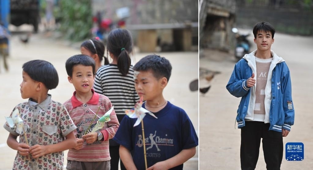 拼版照片:左圖為2012年7月4日,在大化瑤族自治縣板升鄉(xiāng)弄勇小學,7歲的蒙旺兵(左二)在校園里玩風車;右圖為2023年1月25日,在大化瑤族自治縣板升鄉(xiāng)弄勇村,正在桂林理工大學讀大一的蒙旺兵寒假回家時在村中留影?! ⌒氯A社記者 黃孝邦 攝
