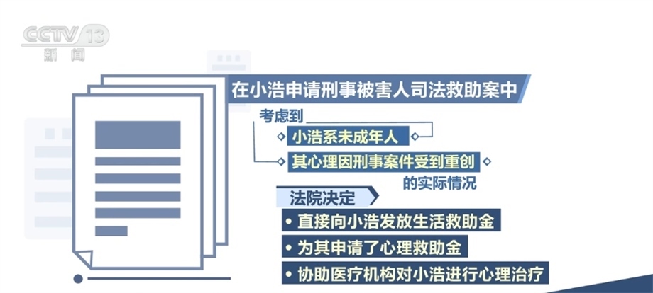 在此次發(fā)布的保護(hù)未成年人權(quán)益司法救助典型案例中,還涉及針對(duì)向未成年人提供專(zhuān)門(mén)心理救助金、提供心理危機(jī)干預(yù)等立體幫扶,進(jìn)一步延伸司法服務(wù)。在小浩申請(qǐng)刑事被害人司法救助案中,小浩的父親被害,其本人亦受到人身傷害,法院作出刑事附帶民事判決,判處被告人死刑,并判決其賠償附帶民事訴訟原告人經(jīng)濟(jì)損失13萬(wàn)余元。后經(jīng)調(diào)查,被告人無(wú)財(cái)產(chǎn)可供執(zhí)行??紤]到小浩系未成年人,其心理因刑事案件受到重創(chuàng)的實(shí)際情況,法院除決定直接向小浩發(fā)放生活救助金外,還為其申請(qǐng)了心理救助金,協(xié)助醫(yī)療機(jī)構(gòu)對(duì)小浩進(jìn)行心理治療。