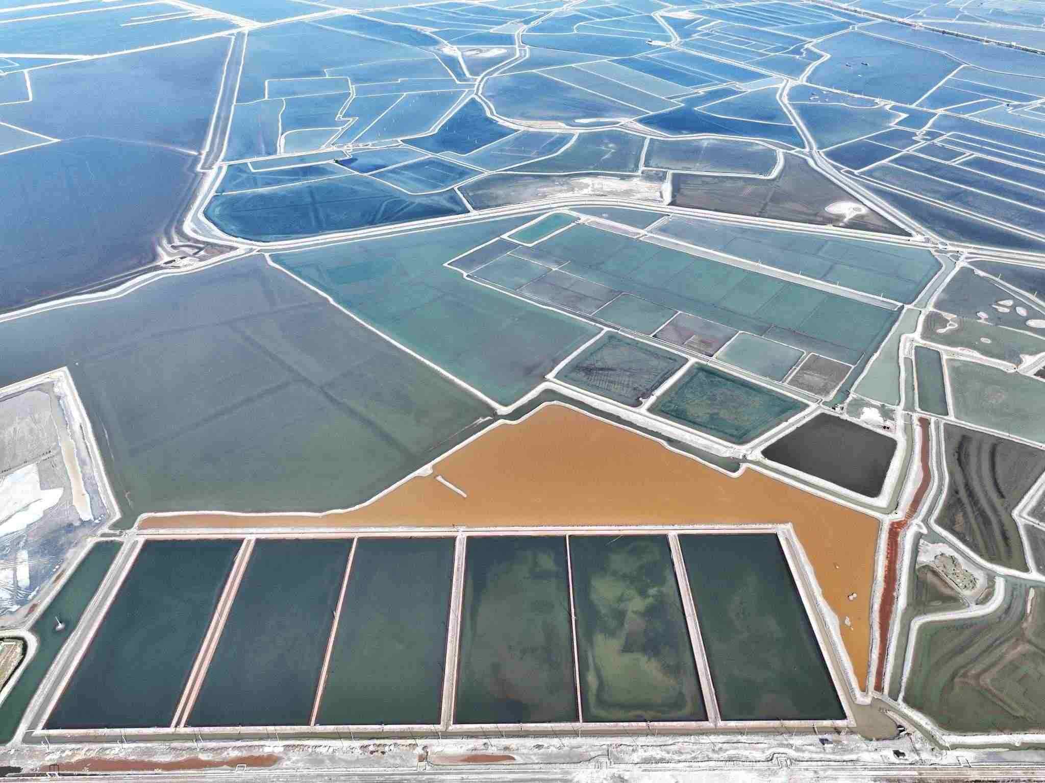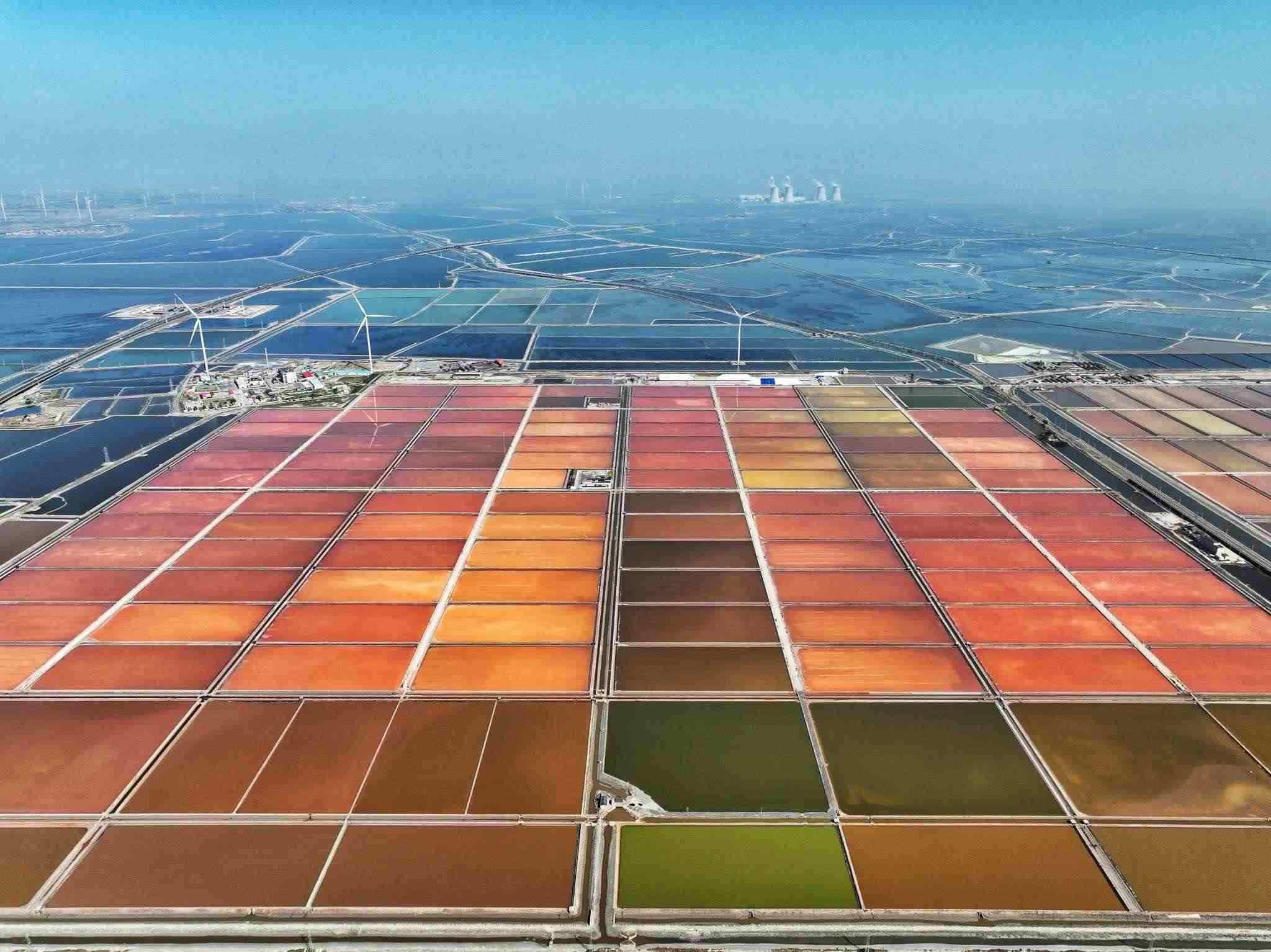 2023年5月22日,天津,位于渤海之濱的長蘆漢沽鹽場色塊分明,俯瞰如大地調(diào)色盤。視覺中國