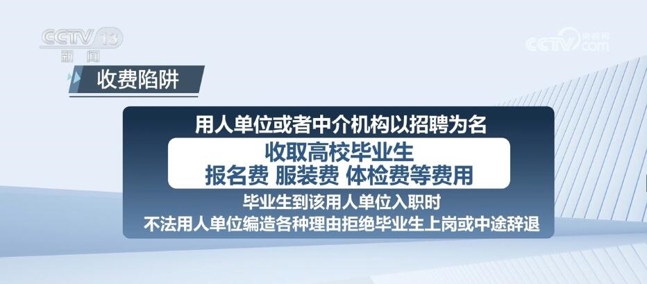 用人單位或者中介機構以招聘為名,收取高校畢業(yè)生報名費、服裝費、體檢費等費用。畢業(yè)生到該用人單位入職時,不法用人單位編造各種理由拒絕畢業(yè)生上崗或中途辭退。