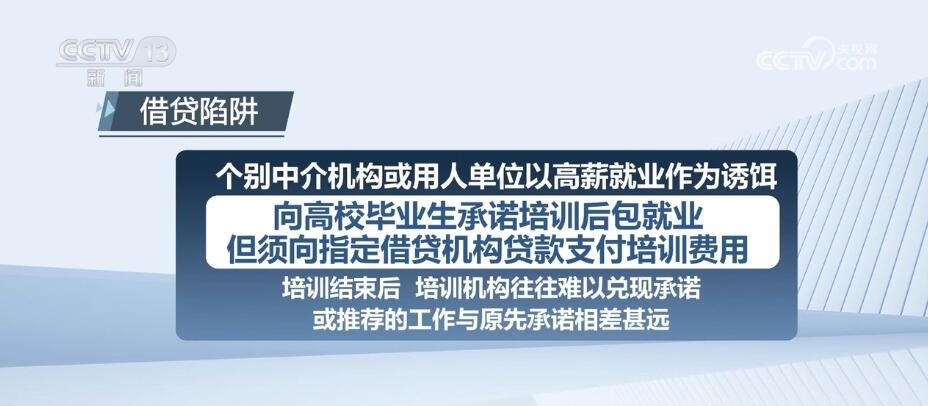 個別中介機構或用人單位以高薪就業(yè)作為誘餌,向高校畢業(yè)生承諾培訓后包就業(yè),但須向指定借貸機構貸款支付培訓費用。培訓結束后,培訓機構往往難以兌現承諾,或推薦的工作與原先承諾相差甚遠。