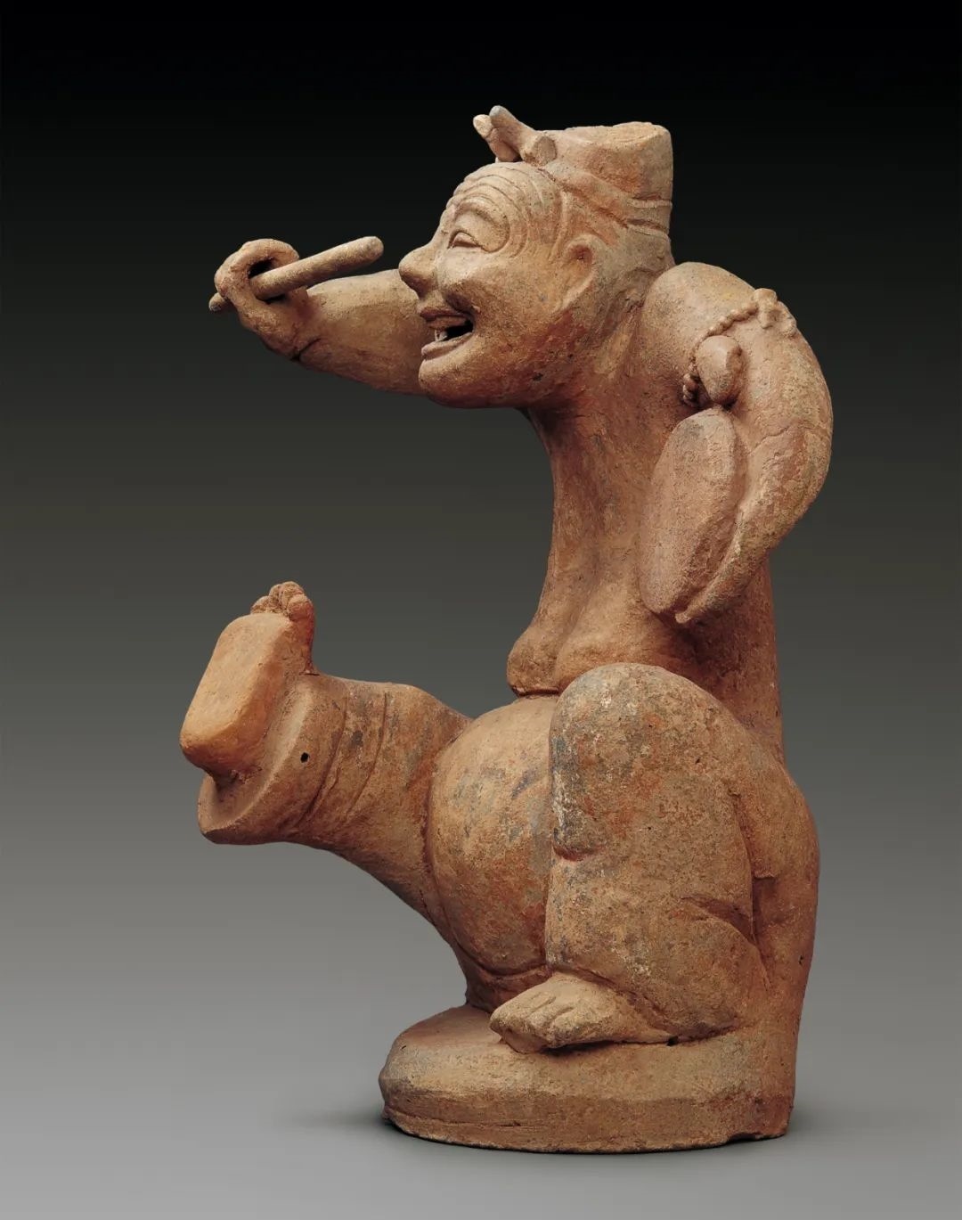漢代民間極為盛行說唱表演。這件陶俑袒胸露腹,著褲赤足,左臂挾鼓,右手舉槌,作擊鼓說唱表演,神態(tài)詼諧,動(dòng)作夸張,是一件富有濃厚民間氣息和地方風(fēng)貌的優(yōu)秀雕塑作品。在四川的東漢墓中先后出土多件形象類似的擊鼓說唱俑,這說明當(dāng)時(shí)蜀地說唱表演頗為流行。