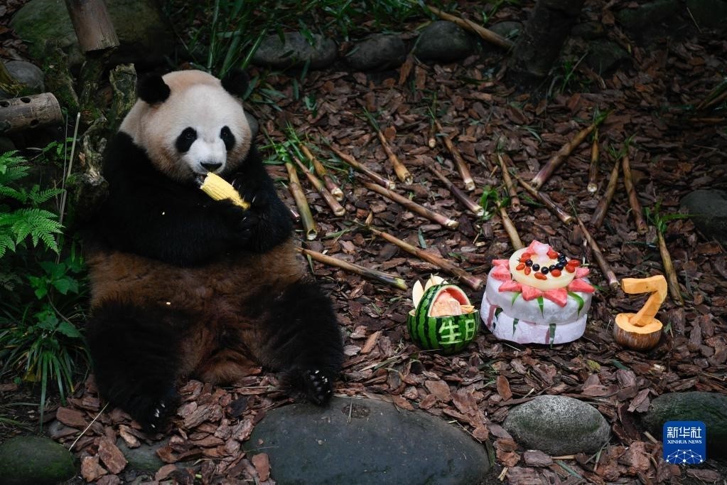 5月29日,市民在成都大熊貓繁育研究基地都江堰野放繁育研究中心為梅蘭慶祝生日。