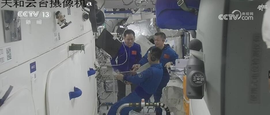 航天科技集團(tuán)五院載人飛船系統(tǒng)項(xiàng)目技術(shù)副經(jīng)理 邵立民:他倆(兩個乘組)之間就可以在對接通道之間相互見到,也可以握手,搞個簡短的歡迎儀式,然后,神十六乘組三個(航天員)就依次能夠進(jìn)入到天和核心艙里面去。如果要真正進(jìn)到核心艙的工作區(qū)里邊,還有一個雙向承壓艙門,也就是在節(jié)點(diǎn)艙和空間站的生活艙之間還有一道艙門。