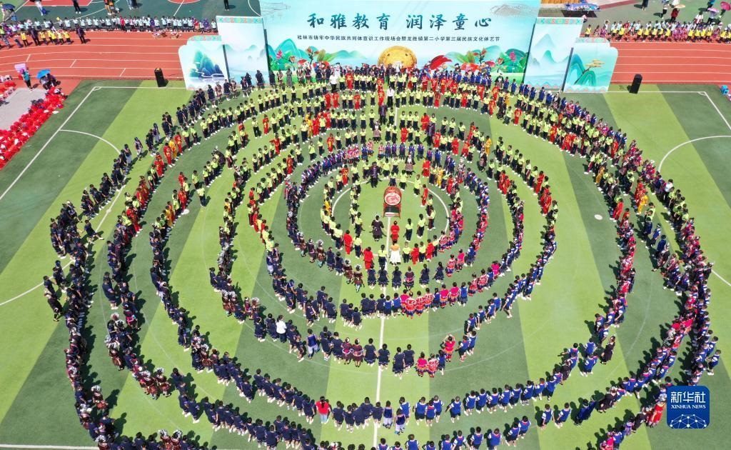 5月30日,在廣西桂林市龍勝各族自治縣龍勝鎮(zhèn)第二小學(xué),師生在跳團(tuán)圓舞(無人機(jī)照片)。 新華社發(fā)(潘志祥攝)