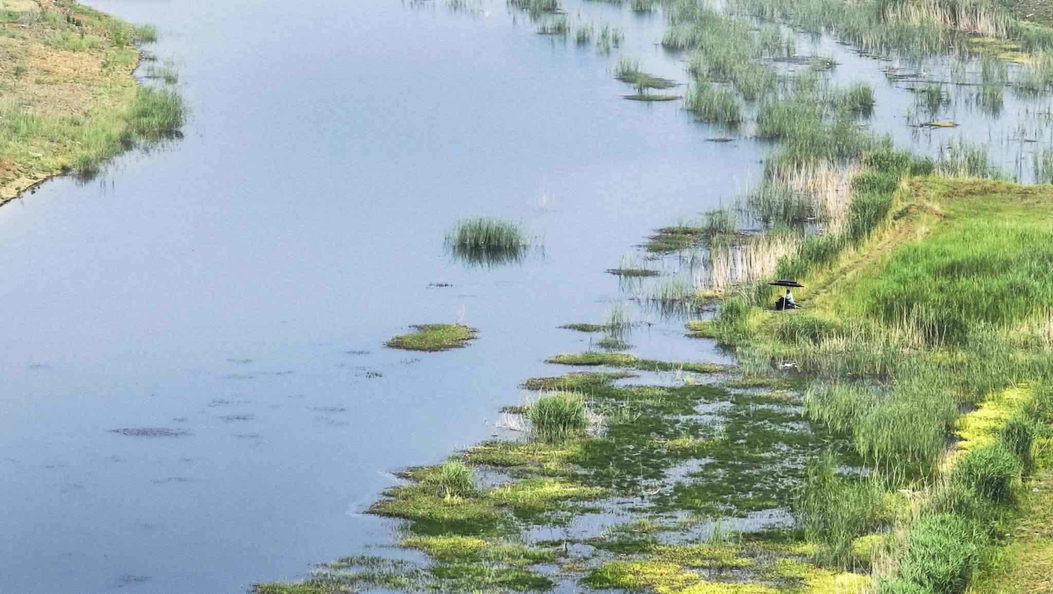2023年5月31日,山東棗莊,薛城區(qū)蟠龍河國(guó)家濕地公園綠意盎然、流水潺潺、水鳥翩躚而至,繪就一幅美麗的生態(tài)畫卷。視覺中國(guó)