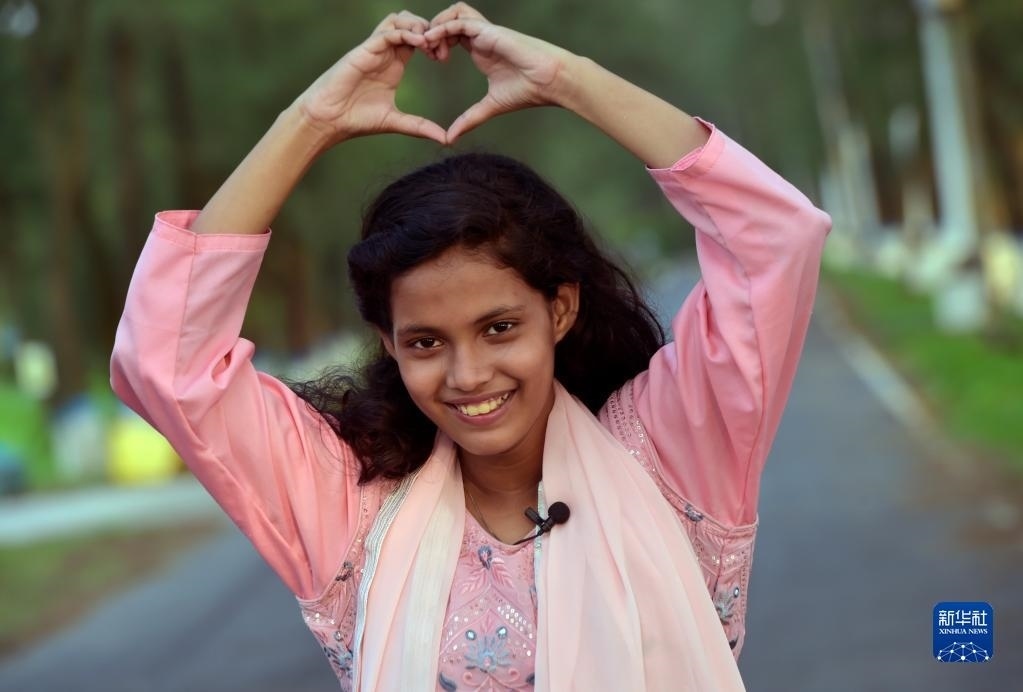 5月26日,在孟加拉國首都達(dá)卡,阿里法·沁做出愛心手勢表達(dá)對中國的愛意。新華社發(fā)
