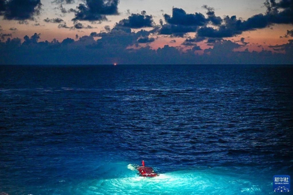 在結束當日的水下調(diào)查后,搭載著考古隊員的“深海勇士”號載人潛水器浮出海面(5月27日攝)。