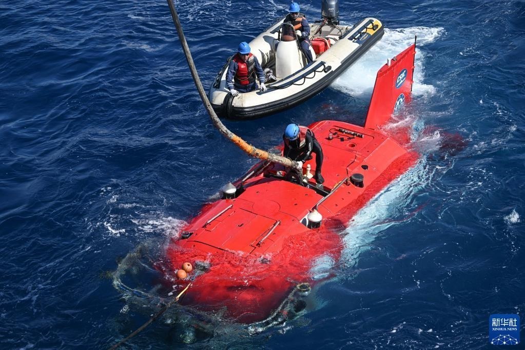 這是在“探索一號”科考船上拍攝的“深海勇士”號載人潛水器,該潛水器用于水下考古數(shù)據(jù)采集(5月26日攝)。