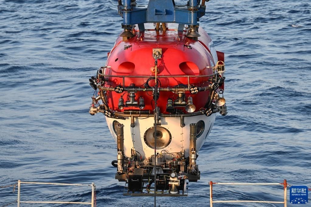 搭載著考古隊員的“深海勇士”號載人潛水器從“探索一號”科考船下放至海面,即將下潛開始當日的水下調(diào)查(5月24日攝)。