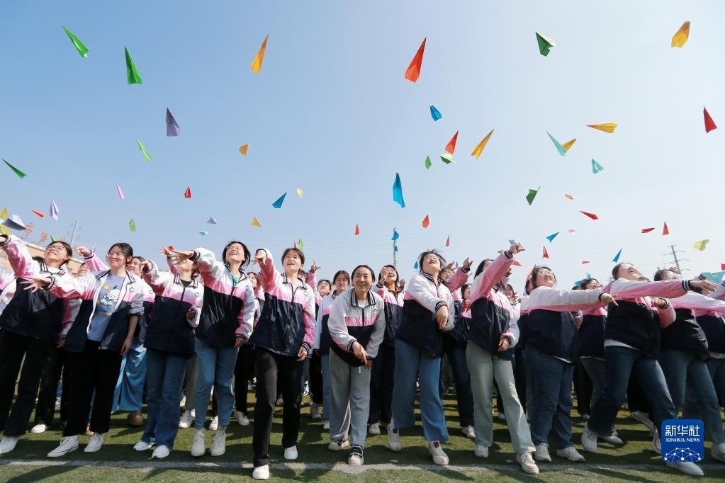 5月31日,在淮北市第十二中學,高三學生在操場上扔紙飛機。