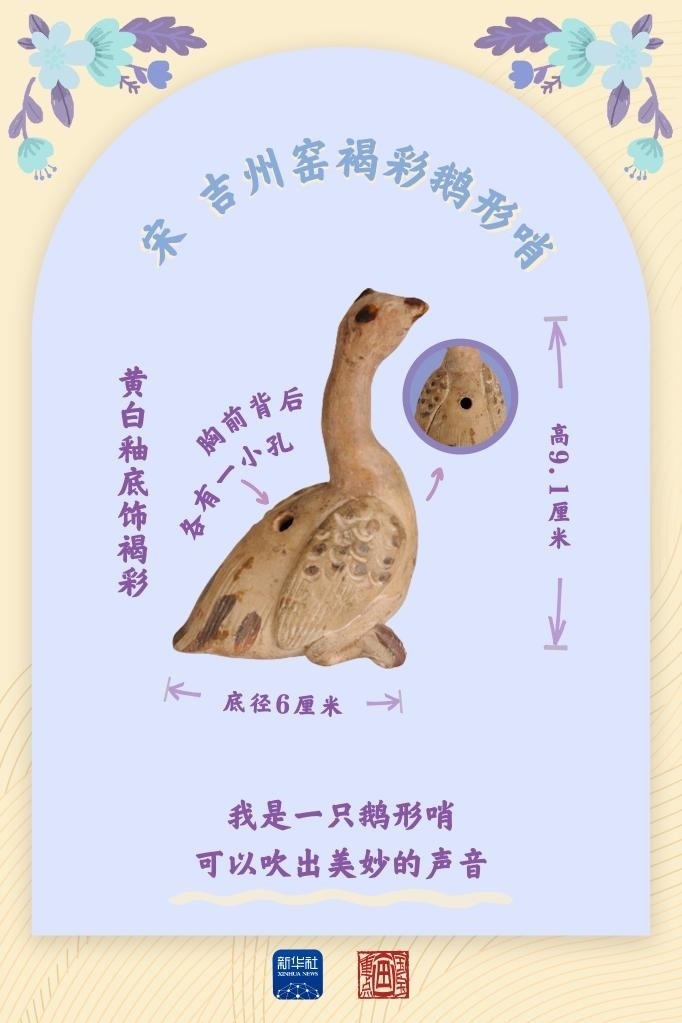 鵝形哨出土于江西吉安的宋代吉州窯遺址。吉安市博物館館長李希朗說,吉州窯的瓷土粗松,有近似于陶的特點,可塑性較強(qiáng)。這里出土的瓷塑大多不超過10厘米,動物瓷塑的原型多為社會生活中所常見。從出土的瓷塑數(shù)量來看,吉州窯當(dāng)年的訂單量很大,頗受市場歡迎。也許每一只鵝形哨的背后,都有一名鼓著腮幫子的稚童。歷經(jīng)時光荏苒,鵝形哨到今天還能發(fā)出動聽的哨音。