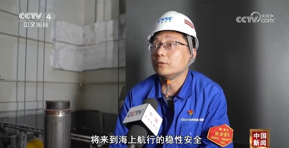 中國船舶外高橋造船大型郵輪項(xiàng)目技術(shù)副經(jīng)理 李嘉寧:這是一個(gè)擺錘,它很重的。這個(gè)是一個(gè)油槽,里面放滿油,上面布置鋼尺,會(huì)精確地讀數(shù)。當(dāng)船發(fā)生傾斜之后,(通過)擺錘移動(dòng)多少的距離就可以知道這個(gè)船橫傾的狀態(tài)。郵輪傾斜試驗(yàn)獲得船舶的重量和重心這兩個(gè)數(shù)據(jù),是大型郵輪最重要的兩個(gè)數(shù)據(jù)指標(biāo),因?yàn)樗鼪Q定了這條船將來到海上航行的穩(wěn)性安全。