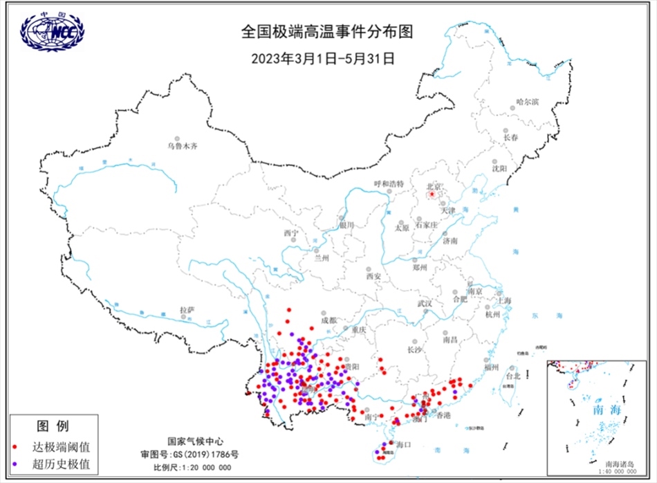 春季,全國共有118個國家氣象站的日降水量突破當月歷史極大值,其中31站的日降水量突破春季歷史極大值,福建邵武(275.1毫米,5月6日)、江西宜黃(258.1毫米,5月6日)、貴州修文(228.3毫米,5月26日)日降水量突破歷史極值。