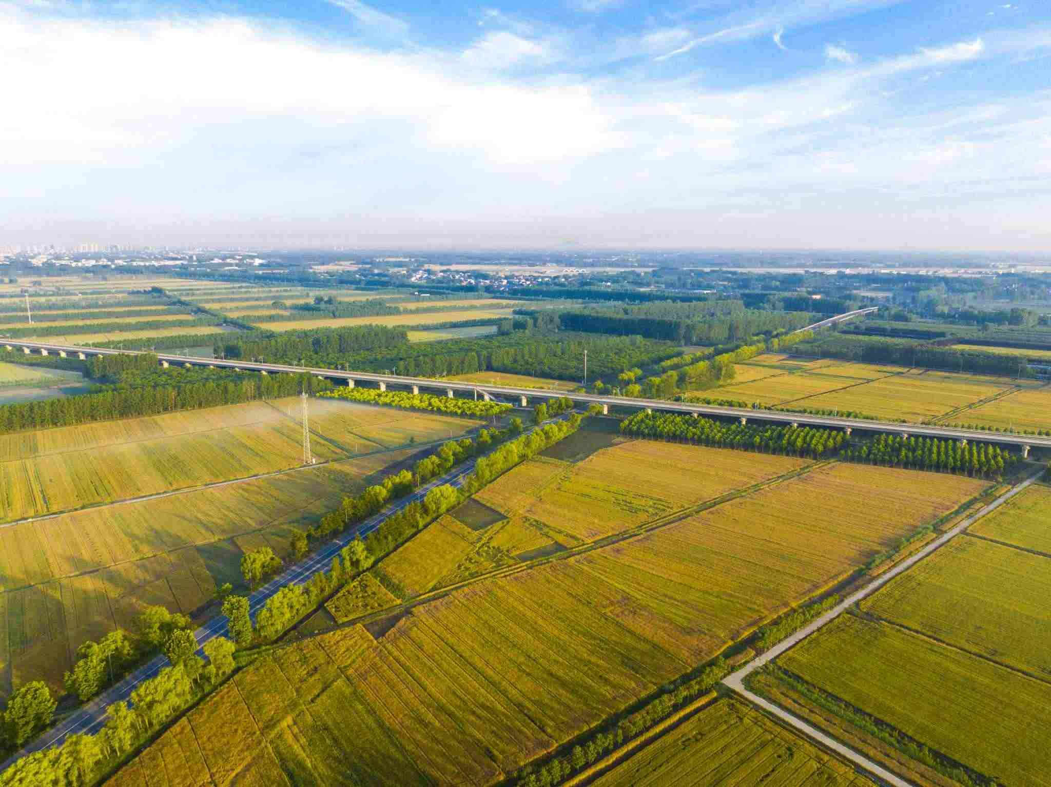 2023年6月3日,江蘇連云港,東??h,金色田野與村莊、道路、河流共同構(gòu)成了一幅秀美的夏日豐收畫卷。視覺中國