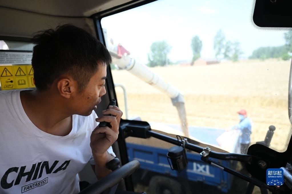 6月2日,在安徽省阜陽(yáng)市阜南縣許堂鄉(xiāng)劉崗村,董斐斐駕駛收割機(jī)將收割的小麥裝車(chē)。