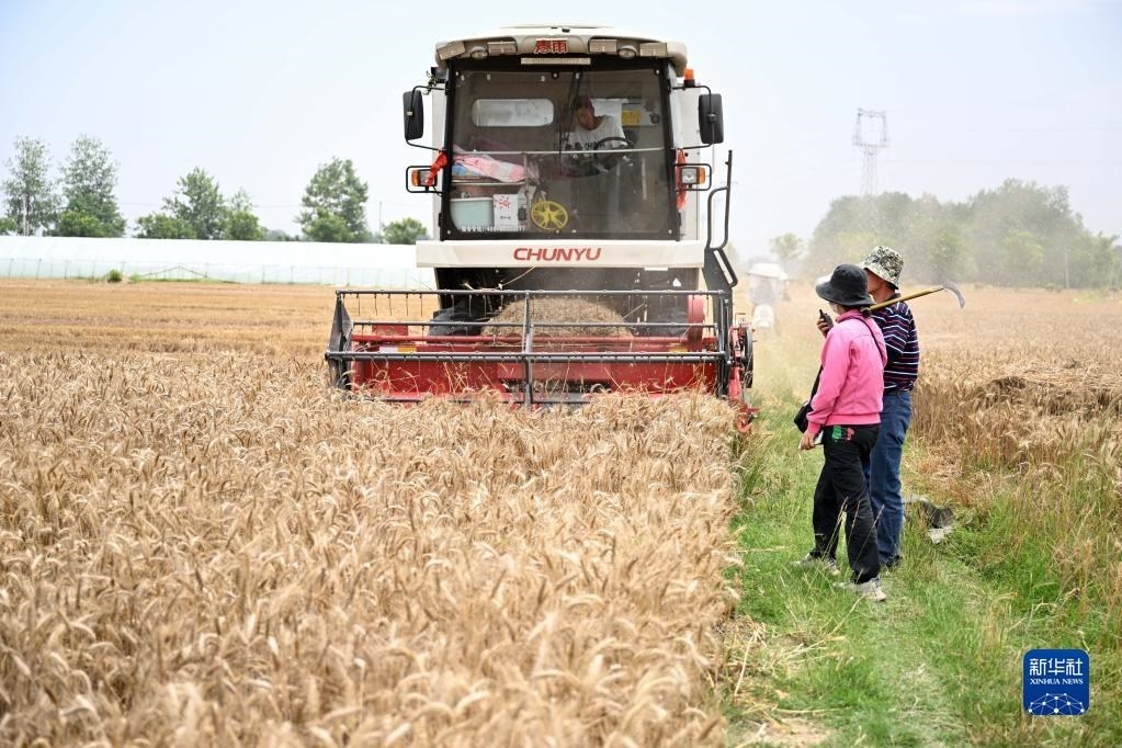 6月2日,在安徽省阜陽(yáng)市阜南縣許堂鄉(xiāng)劉崗村,陳麗娟和村民確認(rèn)收割費(fèi)用。