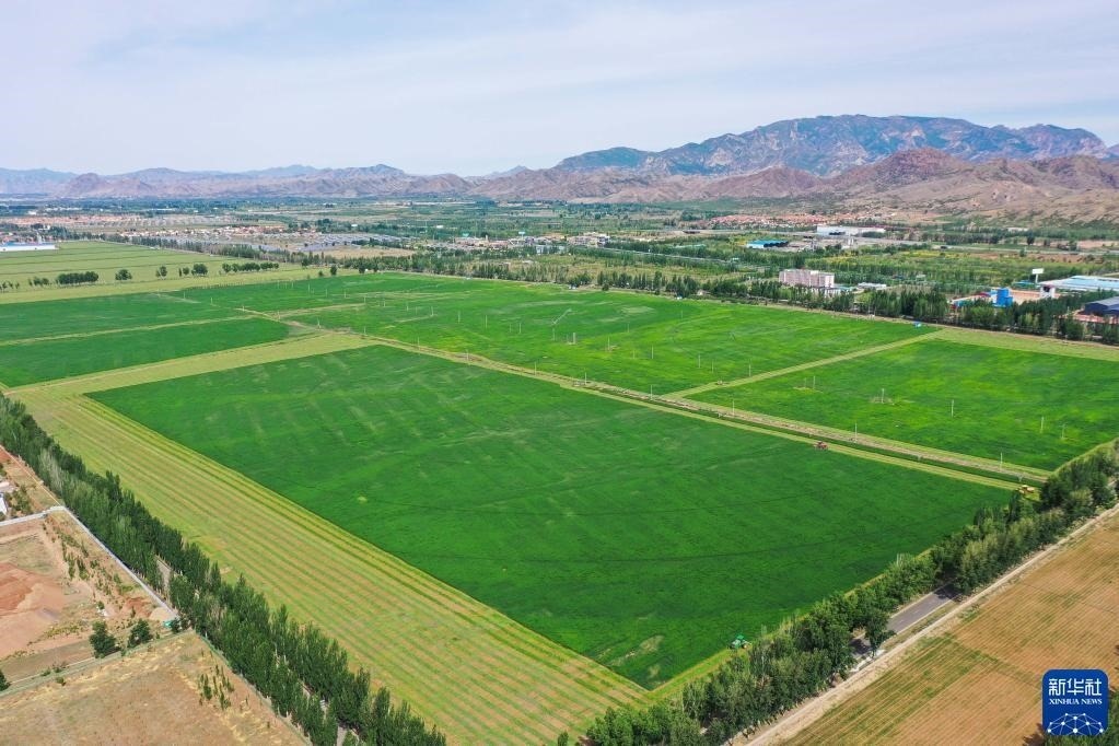 這是6月4日拍攝的土默特左旗國(guó)家現(xiàn)代農(nóng)業(yè)示范區(qū)內(nèi)的苜蓿種植基地(無(wú)人機(jī)照片)。