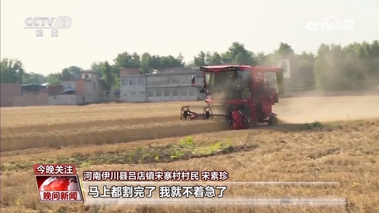 伊川縣呂店鎮(zhèn)宋寨村村民 宋素珍:前幾天下雨小麥?zhǔn)詹换貋?,心里可心慌,鄉(xiāng)里派履帶式收割機(jī),我這十幾畝地馬上都挨?。ㄝ喌剑┝?,馬上都割完了,我就不著急了。