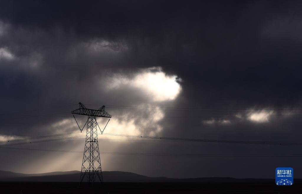 這是在青??煽晌骼锱臄z的青藏聯(lián)網(wǎng)工程一座輸電鐵塔(6月2日攝)。