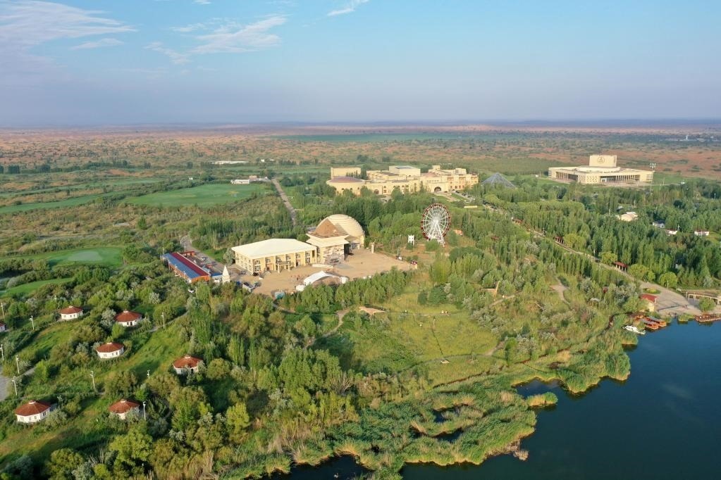 這是內(nèi)蒙古鄂爾多斯市庫(kù)布其沙漠腹地的七星湖景區(qū)(2021年7月17日攝,無(wú)人機(jī)照片)。新華社記者 金良快 攝