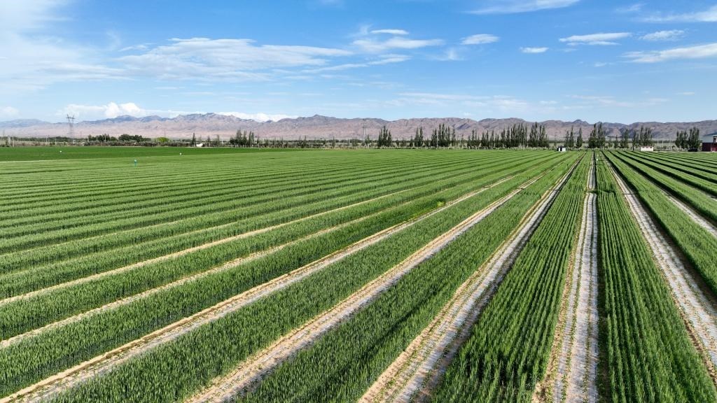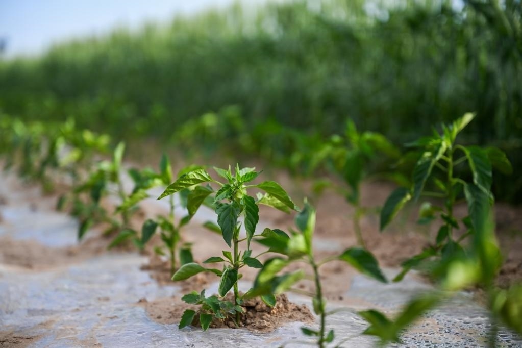 這是6月5日拍攝的位于烏梁素海南岸的現(xiàn)代農(nóng)業(yè)示范園區(qū)內(nèi)小麥、辣椒帶狀種植田。新華社記者 連振 攝