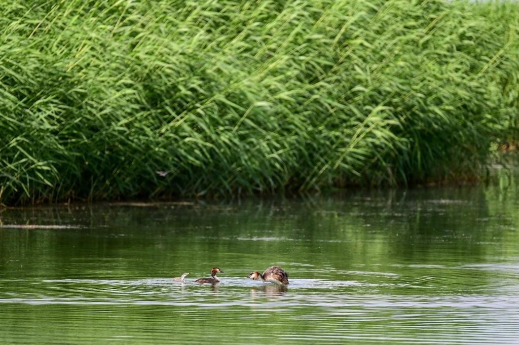 6月5日,水鳥在烏梁素海水面上嬉戲。新華社記者 連振 攝