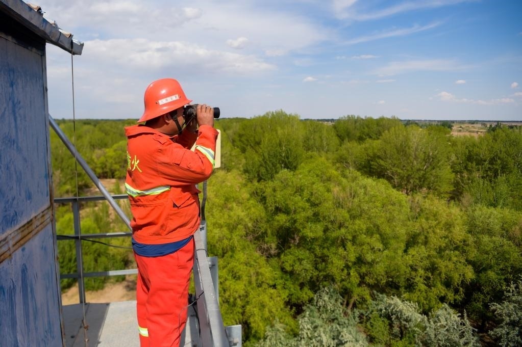 6月5日,臨河區(qū)國(guó)營(yíng)新華林場(chǎng)護(hù)林員在開展巡護(hù)工作。新華社記者 李志鵬 攝