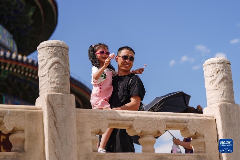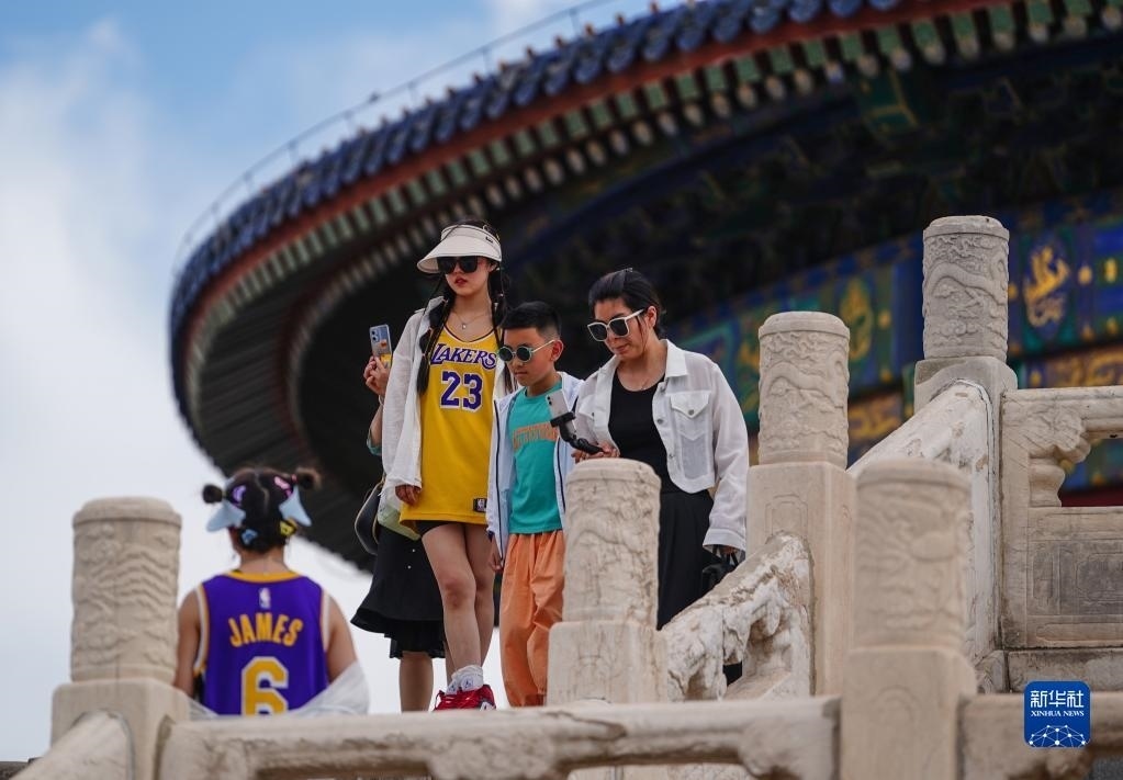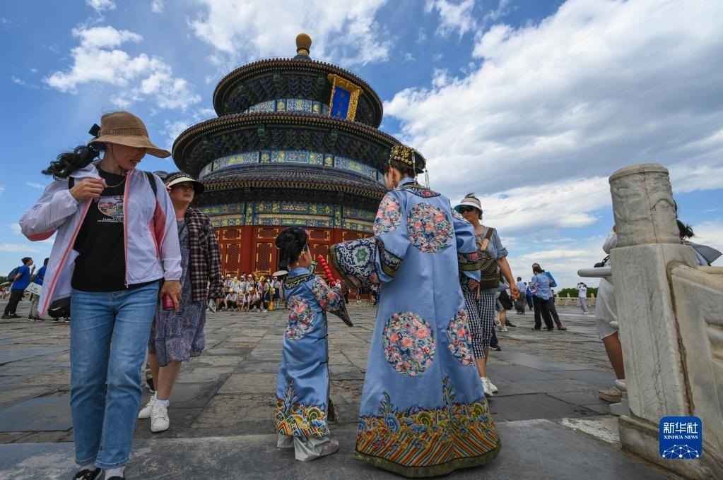 6月9日,游客在藍(lán)天白云下的天壇祈年殿游覽。