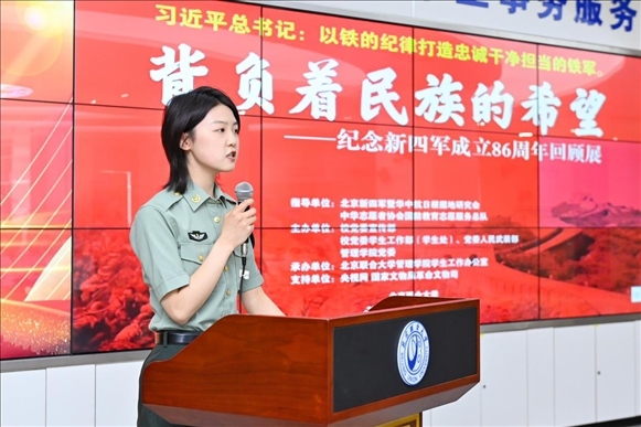 為深入學習貫徹習近平新時代中國特色社會主義思想主題教育,落實習近平加強全民國防教育的重要指示精神,弘揚愛國主義精神、增強全民國防意識,推動全民國防教育進校園,深化學?!按笏颊n”建設,6月9日,由北京新四軍暨華中抗日根據(jù)地研究會、中華志愿者協(xié)會國防教育志愿服務總隊指導,北京聯(lián)合大學黨委學生工作部(學生處)、黨委人民武裝部、黨委宣傳部、北京聯(lián)合大學新時代文明實踐中心建設規(guī)劃研究所、管理學院黨委共同主辦,管理學院學生工作辦公室承辦的“背負民族希望——紀念新四軍成立86周年回顧展”大會在北四環(huán)校區(qū)學生事務大廳舉行。