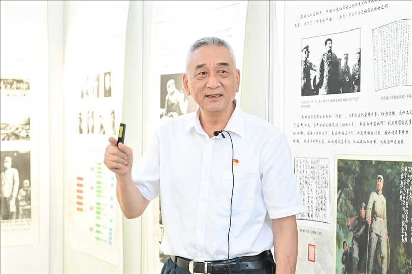 會后,領導嘉賓觀看“背負民族希望—紀念新四軍成立86周年回顧展”,張曉龍現(xiàn)場給大家講述新四軍的歷史沿革和征戰(zhàn)歷程。